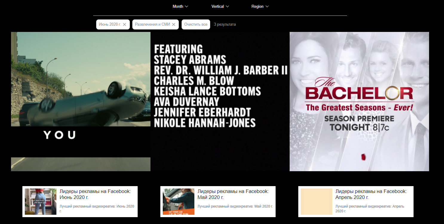 В параметрах поиска задайте месяц, за который хотите посмотреть лучшую рекламу, отрасль и регион. В регионах пока доступны только США.