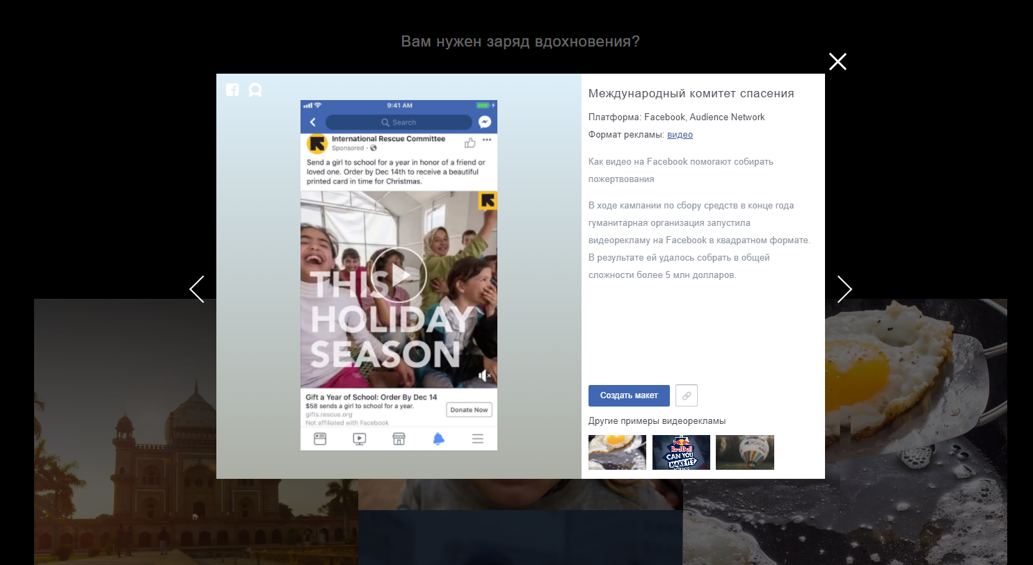 «Вдохновение» — это раздел, где Facebook собирает примеры лучших объявлений. Объявления отбирает Creative Shop — команда маркетологов, креативных директоров и стратегов, которые предлагают идеи для продвижения и развития бизнеса. Помимо примеров привлекательных объявлений, в разделе также есть инструкции для создания качественной рекламы.