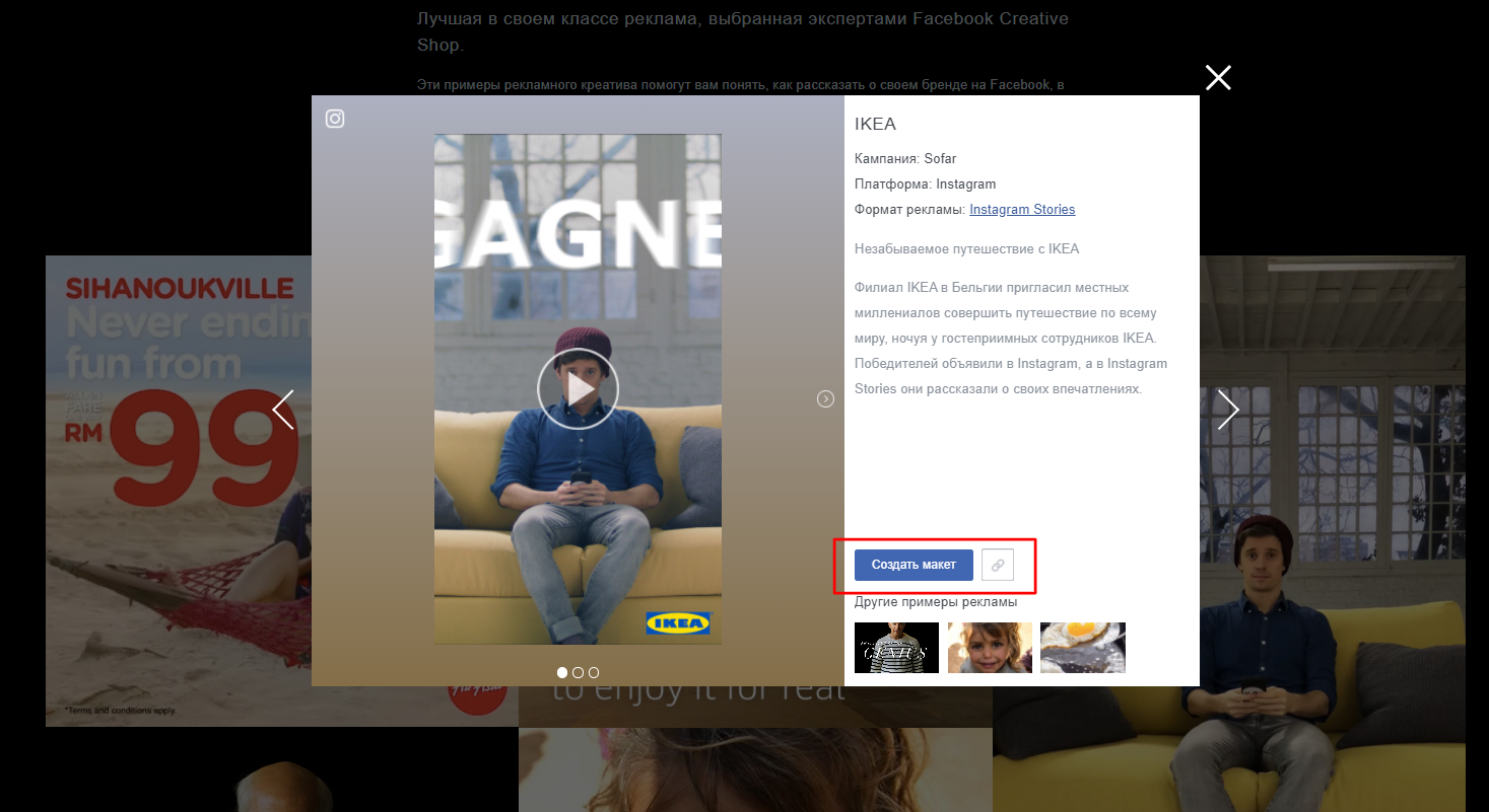 На основе любого понравившегося объявления можно сразу создать макет для собственной рекламы. Для этого кликните на объявление и нажмите «Создать макет». Система перенаправит вас в Креативный центр Facebook, где вы сможете создать свою рекламу на основе макета.