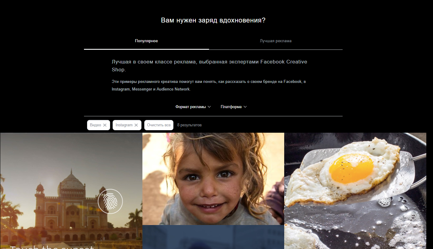 Во вкладке «Популярное» вы найдете примеры лучших рекламных объявлений для разных плейсментов по версии Facebook Creative Shop. В параметрах поиска задайте формат рекламы (фото, видео, кольцевая галерея, Instant Experience, Stories, Messenger) и выберите платформу (Facebook, Instagram, Audience Network, Messenger). Пока на площадке доступны только примеры объявлений на английском языке, но интерфейс переведен на русский язык.