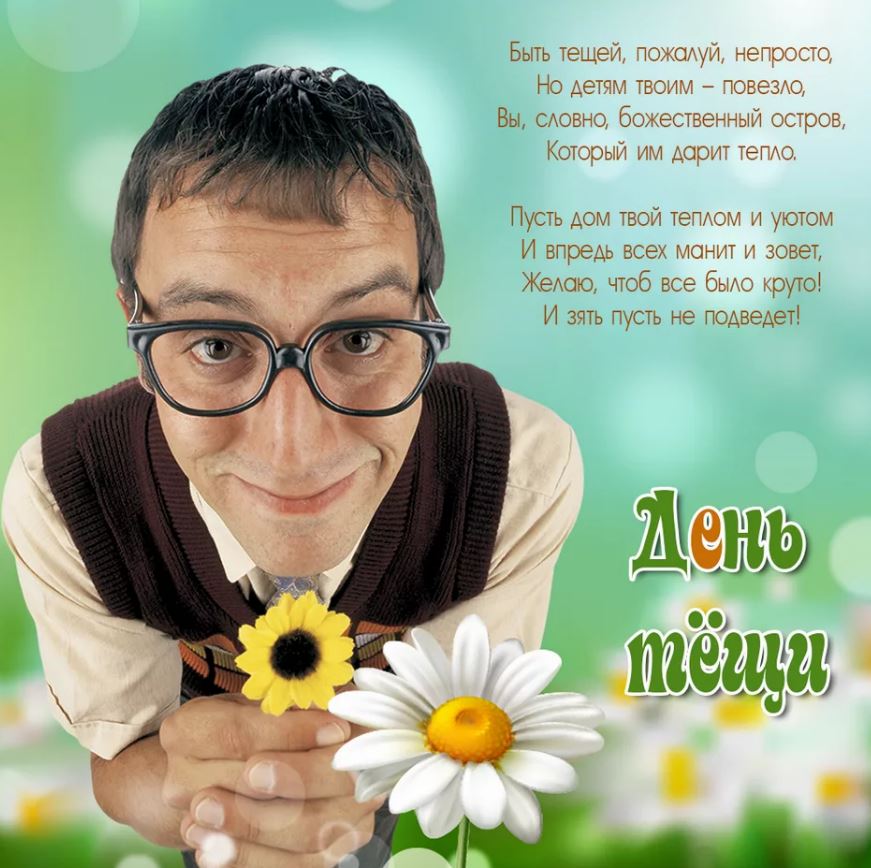 С Днём тёщи. Желаю быть самой весёлой и озорной, самой доброй и чуткой, самой красивой и умной, самой бодрой и жизнерадостной, самой любимой и любящей тёщей на всей планете. Здоровья Вам и семейного благополучия, уважения и достатка в жизни. И пусть Ваш зять всегда Вас осыпает комплиментами и добрыми словами.