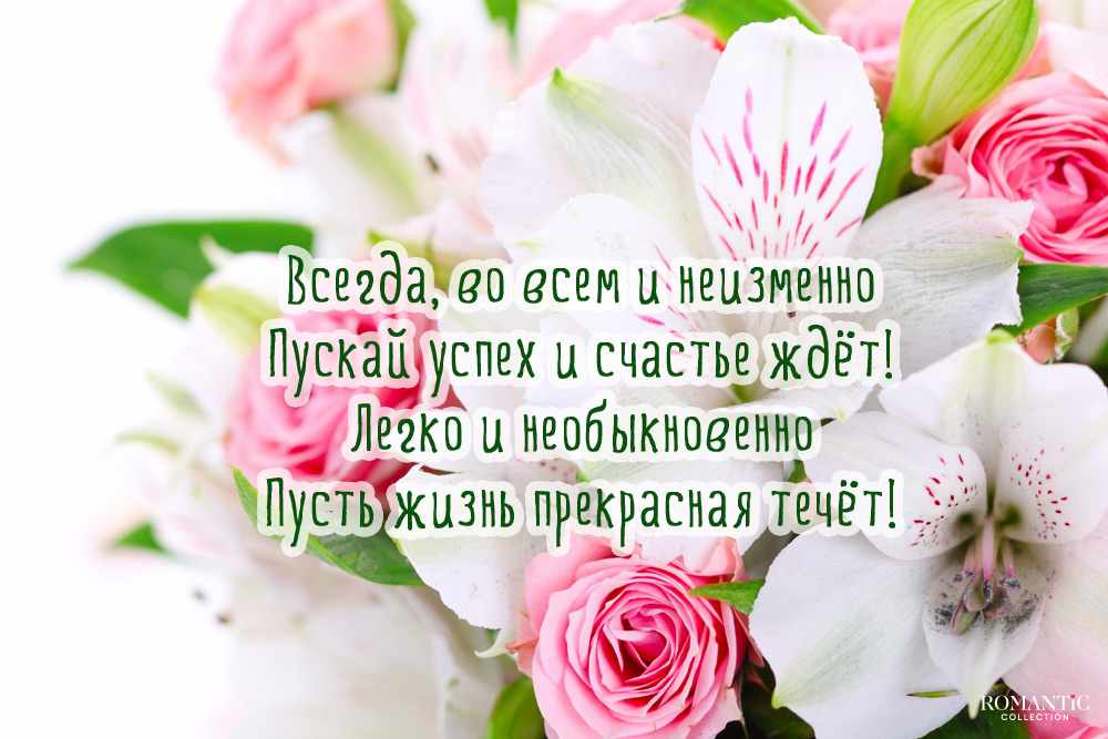 Всегда, во всем и неизменно Пускай успех и счастье ждет! Легко и необыкновенно Пусть жизнь прекрасная течет!