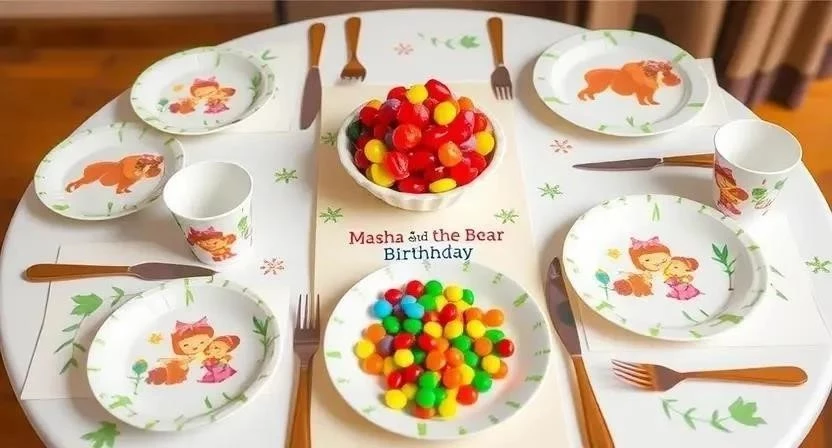 Чтобы создать атмосферу сказочного леса, необходимо тщательно продумать декор и оформление помещения. Используйте зеленые, коричневые и бежевые цвета, чтобы имитировать лесную обстановку. Украсьте комнату воздушными шарами в форме Маши и Медведя, гирляндами из листьев и цветов, плакатами с изображением любимых героев мультфильма. Обязательно создайте фотозону, где дети смогут сделать памятные фотографии с атрибутикой мультфильма, такой как корзинка с грибами, деревянные бочки и мягкие игрушки. Я помню, как мы с дочкой делали гирлянды из бумажных цветов и листьев, и это было очень весело! Мы также распечатали большие фотографии Маши и Медведя и развесили их по всей комнате. Не забудьте про скатерть и посуду в стиле мультфильма. Можно использовать одноразовую посуду с изображением Маши и Медведя или приобрести многоразовую посуду в зеленых и коричневых тонах.