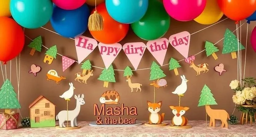 - Как украсить помещение в стиле «Маша и Медведь»? Используйте зеленые, коричневые и бежевые цвета, воздушные шары, гирлянды и плакаты с изображением любимых героев мультфильма.