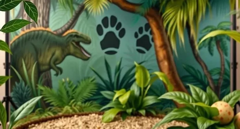 1. Фон: Используйте баннер с изображением пейзажа юрского периода или создайте фон из искусственных растений и камней.