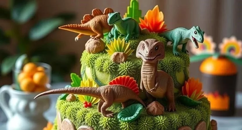 1. Торт динозавр: Закажите торт в форме динозавра или украшенный фигурками динозавров.