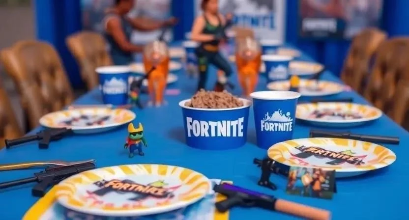 - Воздушные шары: В цветах Fortnite (фиолетовый, синий, зеленый) или с изображением логотипа игры.