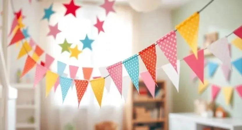 Гирлянды и флажки – это простой и доступный способ украсить комнату. Их можно сделать своими руками из бумаги, ткани или картона. На флажках можно написать поздравления, имена гостей или просто нарисовать яркие картинки. Гирлянды можно повесить на стены, потолок или оформить ими окно. Для изготовления гирлянд можно использовать различные материалы: цветную бумагу, фетр, бусины, ленты. Однажды я сделала гирлянду из фотографий моего сына – ему очень понравилось рассматривать свои детские фотографии с друзьями.