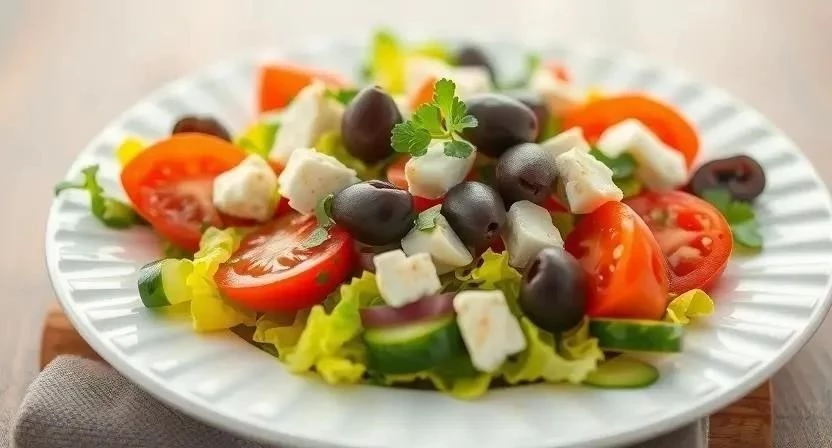 - Салат «Греческий»: Простой, но очень вкусный салат из свежих овощей, сыра фета и оливок.
