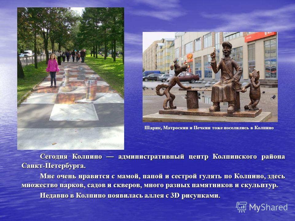 Сегодня Колпино административный центр Колпинского района Санкт-Петербурга. Мне очень нравится с мамой, папой и сестрой гулять по Колпино, здесь множество парков, садов и скверов, много разных памятников и скульптур. Недавно в Колпино появилась аллея с 3D рисунками. Шарик, Матроскин и Печкин тоже поселились в Колпино