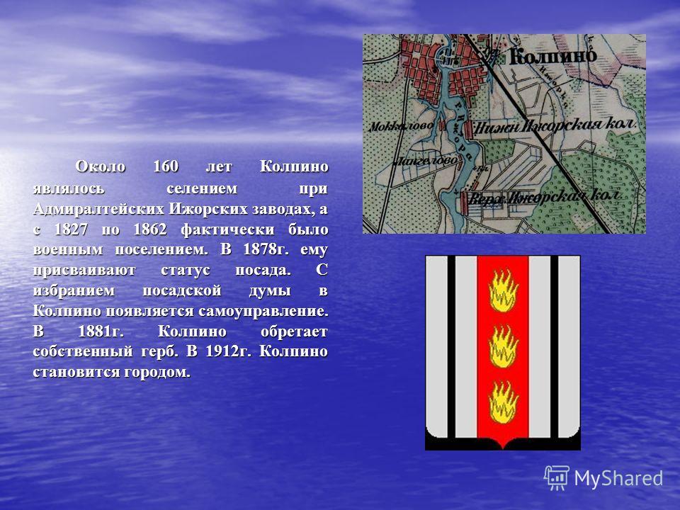 Около 160 лет Колпино являлось селением при Адмиралтейских Ижорских заводах, а с 1827 по 1862 фактически было военным поселением. В 1878г. ему присваивают статус посада. С избранием посадской думы в Колпино появляется самоуправление. В 1881г. Колпино обретает собственный герб. В 1912г. Колпино становится городом.