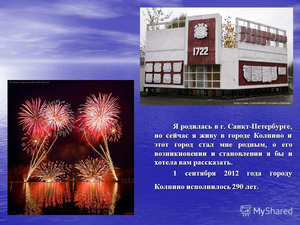 Я родилась в г. Санкт-Петербурге, но сейчас я живу в городе Колпино и этот город стал мне родным, о его возникновении и становлении я бы и хотела вам рассказать. 1 сентября 2012 года городу Колпино исполнилось 290 лет.