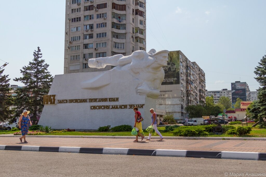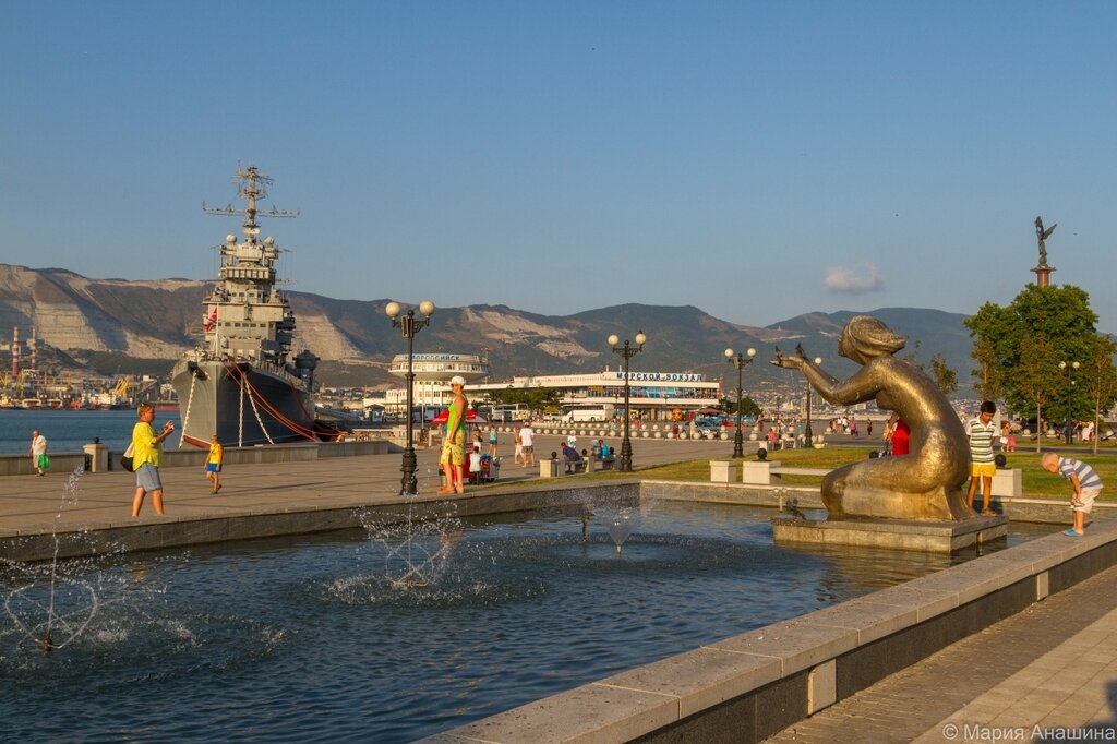 Еще когда мы ехали из Анапы в Геленджик, мне очень понравился Новороссийск. И, естественно, мы туда поехали на машине, причем дважды. Единственное, что омрачало поездки — очень жаркая погода. Поэтому комфортнее было смотреть на город из машины с кондиционером, а не ходить по нему ногами. Тем не менее, мы посмотрели немало: совершили морскую прогулку по Цемесской бухте, побывали на крейсере «Михаил Кутузов», съездили на Малую Землю, увидели памятник морякам Революции.