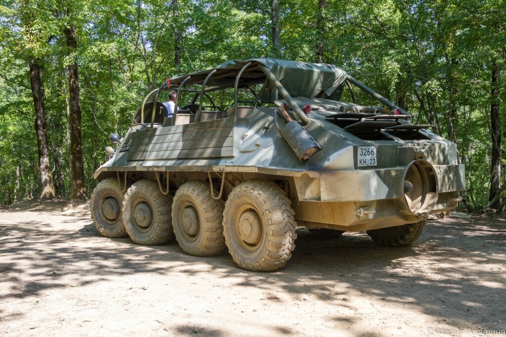 Примечание Вежливой Панды: БТР…. На самом деле это кустарная модернизация, скорее всего выполненная на базе БТР-60ПБ (или БТР-60ПА) путем срезания верха корпуса и башни и наваривания дуг безопасности. Так же БТР лишился заслонок водомета, но приобрел в боевом отделении настил и сиденья для туристов. Хорошо что хоть танком не обозвала…