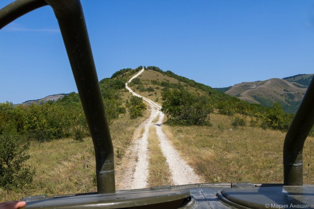 Сначала (еще на автобусе) мы посмотрели некоторые достопримечательности в поселке Возрождение: водопад на реке Жане, дольмен «Здоровье». На БТРе мы поднялись в горы, увидели дольмен Любви, потом побывали на горных вершинах, вдали увидели крепость «Грозовые ворота». Затем спустились к реке Ачибс, по ней уже пешком прошли вверх по течению. А потом поехали обедать в фермерское хозяйство. Впечатлений, конечно, море. Подробнее читайте в статье «Отдых в Геленджике: поездка на БТР в горы».
