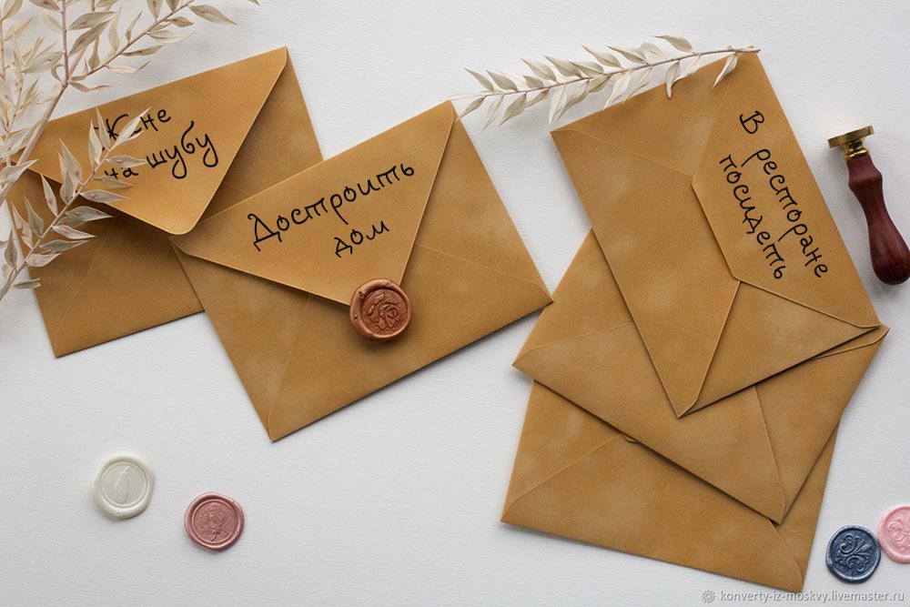 Конвертики с целью. Лучше использовать купюры по 100-200 рублей, чтобы вышло больше конвертиков. Также сложите купюры пополам. Вырежьте из крафтовой бумаги небольшие квадраты. В них должна помещаться купюра и не касаться краев. Вырезайте с отступом в два сантиметра. Позже положите купюру в центр конверта и заклейте его. Клеить надо, сгибая края к центру. После этого напишите на каждом конверте, на что пойдет эта сумма. Подписи должны быть с юмором. Например, «На порш каейн» , «в ресторане посидеть», «достроить дом», «купить жене шубу». Конечно, сначала сумма покажется маленькой, но когда мужчина увидит количество конвертов, то обрадуется.