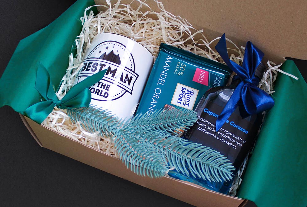 В оформлении мужских подарков декор используют минимально. В качестве упаковочного материала можно использовать: