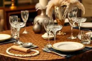 | «Великий Гэтсби» | Золотой, черный, белый | Перья, жемчуг, бокалы для шампанского | Роскошный особняк, вечеринка 1920-х годов |