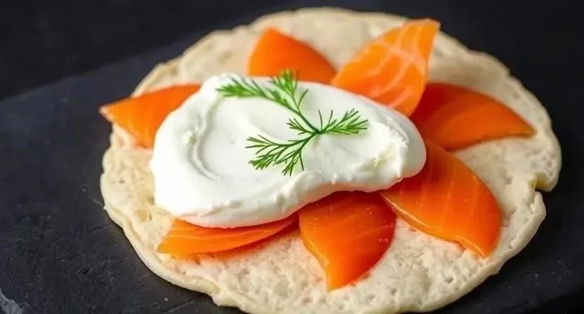 2. Намажьте блин сливочным сыром и выложите сверху рыбу.