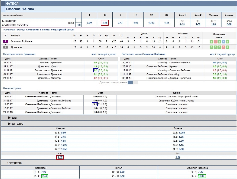 Наш выбор – матч высшего дивизиона Словении «Домжале – Олимпия». Игра «низовая» – кэф 1.65 на ТМ(2.5), прогнозируется упорная борьба, букмекер отдает небольшое преимущество гостям (они выше в таблице – 2-е место против 4-го).