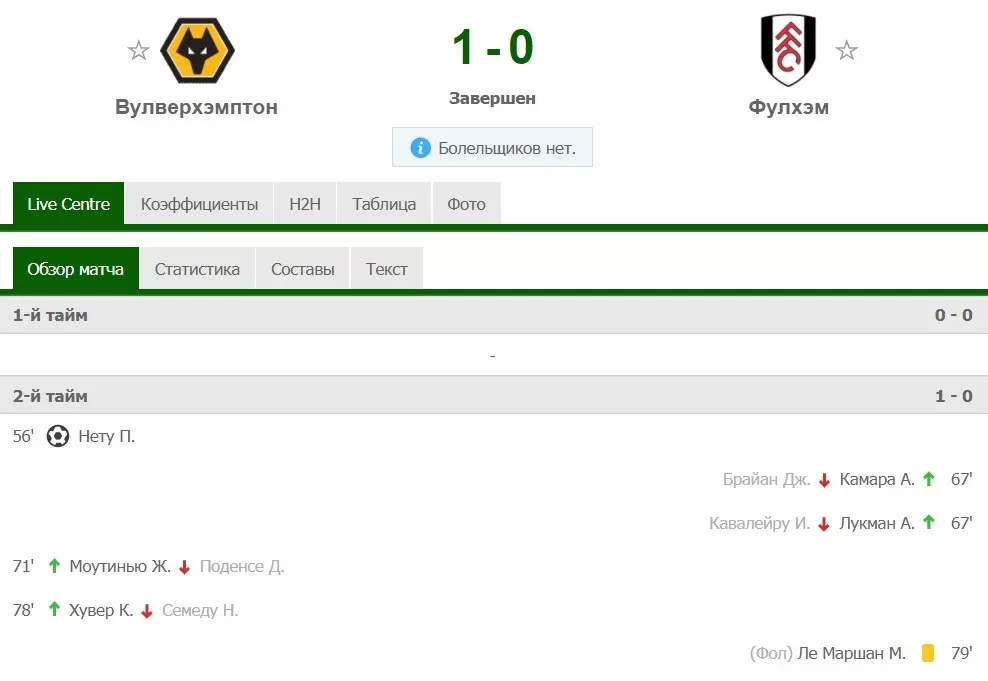 В качестве примера можно привести матч Вулверхэмптон-Фулхэм, прошедший 4 октября 2020 года в рамках английской Премьер-лиги. Команды примерно равны по силе. «Вулвз» выбрал активную стратегию нападения. Норвич оборонялся, причем весьма эффективно. В результате в первой половине второго тайма «волкам» удалось забить всего 1 мяч.