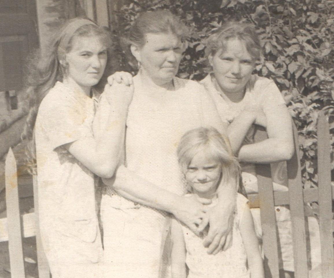 Родилась прабабушка Лена 24 декабря 1926 года и выросла в деревне Коммуна Усть-Таркского района. В семье было шестеро детей. Они рано потеряли мать. Мачеха, которую привёл отец, не стремилась детям заменить родную маму: она жестоко обращалась с детьми. Когда началась Великая Отечественная война, моей прабабушке, как и мне сейчас, было 15 лет. В начале войны дети осиротели: умерли и мачеха, и родной отец. Младших братьев Валю и Петю забрали в детский дом. Старшего брата война застала на дальнем востоке, он там проходил службу. Сестра Галина была отправлена работать в город Новосибирск на завод по производству боевых снарядов. Бабушка осталась одна. Но она не пала духом, и продолжая жить в одиночестве, трудилась на благо Родины.(Слева на право: баба Лена, её сестра Галина и подруга).