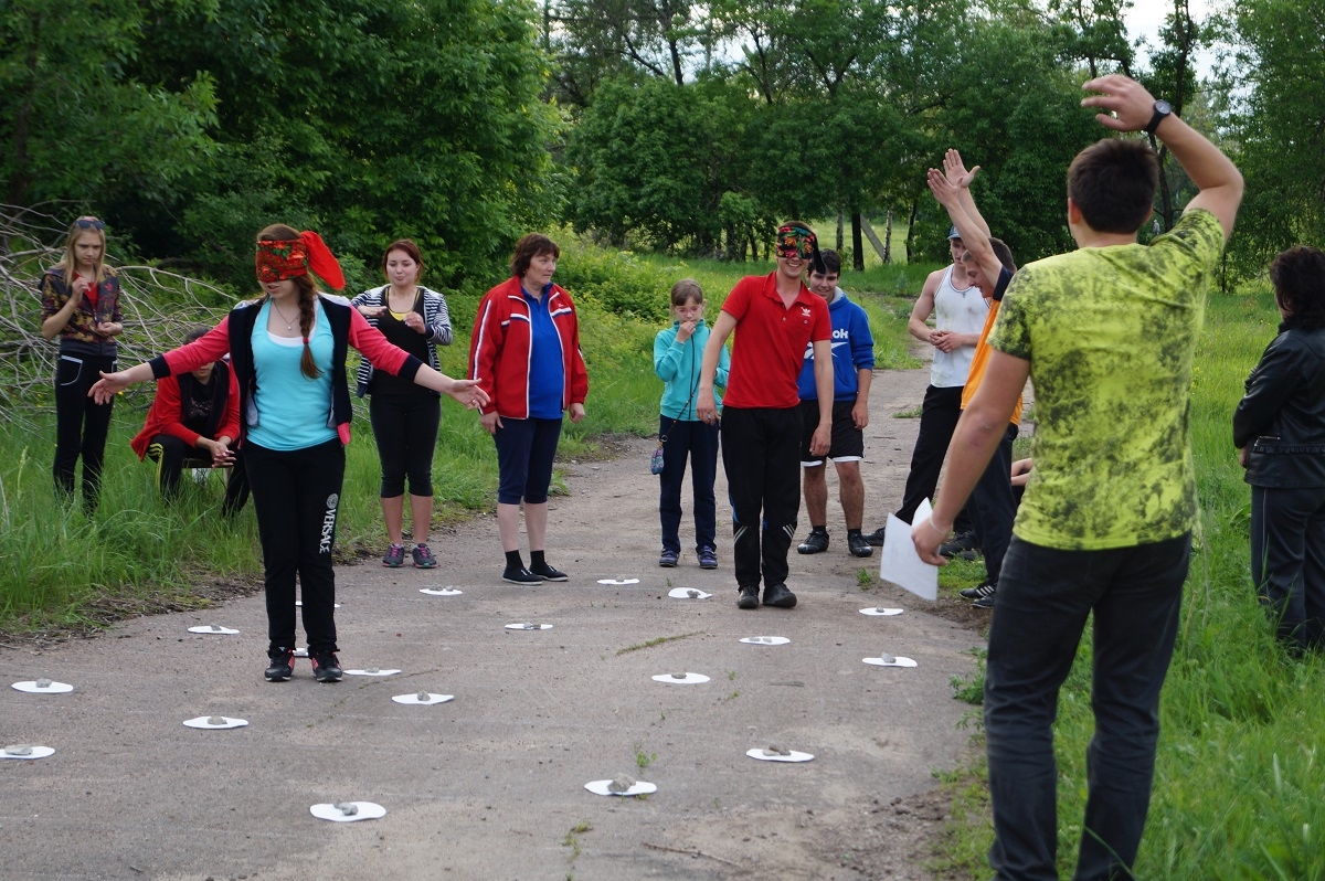 Участникам предстоит пройти через заминированное поле и не подорваться. Игроки с завязанными глазами должны обойти 8 мин (кеглей или пластиковых бутылок). Побеждает команда, ребята из которой задели меньше всего мин.