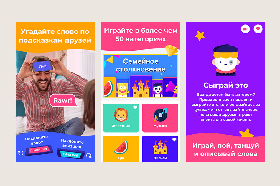 Для игры достаточно одного телефона. Все, что вам нужно сделать, – это угадать слово на карточке. В игре можно самостоятельно составить раунды и выбрать категории слов.