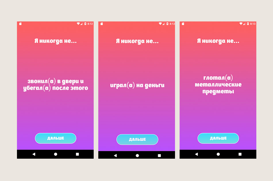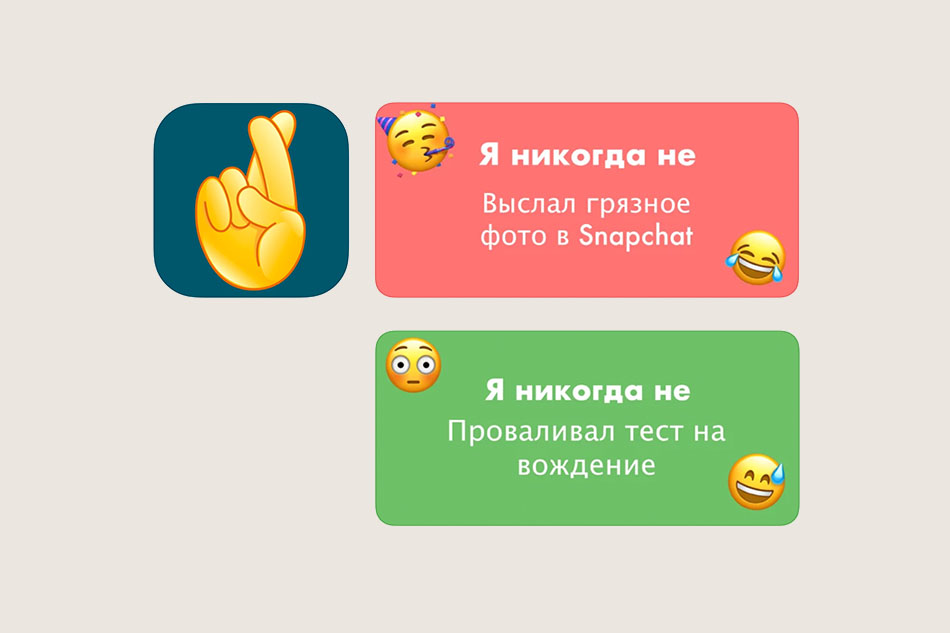 Кто-то из компании говорит: «Я никогда не…» – и зачитывает вслух надпись на экране. Если вы это делали, то выпиваете из своего бокала или выполняете наказание от других игроков.
