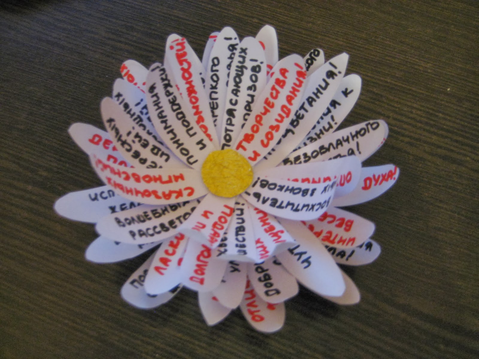 На подносе находится бумажная имитация цветка. В серединке название конкурса, соответствующее названию цветка, по краям белые лепестки. Лепестки повернуты белой стороной вверх. Задача каждого игрока взять по одному лепестку и обязательно выполнить задание. Примеры могут быть следующими: