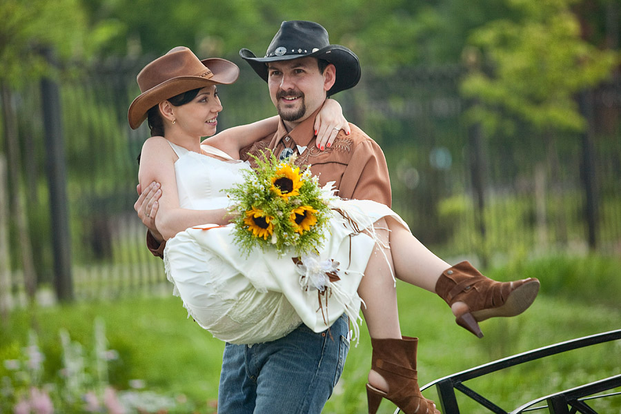 Вход к красавице-невесте украшают плакатами с изображениями Дикого Запада, разноцветными шарами в форме цветков и кактусов. Подружки невесты танцуют зажигательный кан-кан, встречая жениха с гостями, а потом выдают им шляпы.