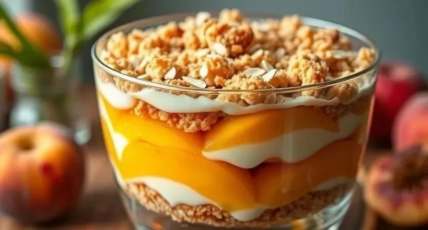 | Трайфл с персиками и миндалем | Бисквит, персики в сиропе, миндальные хлопья, крем с миндальным экстрактом |