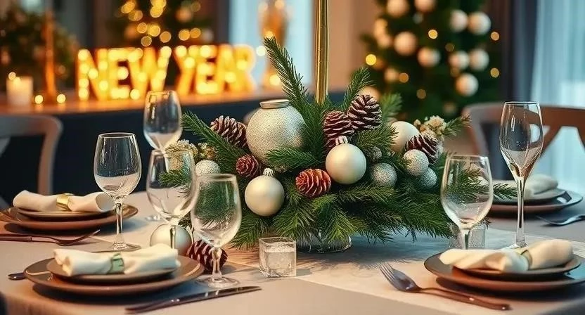 Декор стола на Новый год: Идеи украшений, гирлянды, еловые ветки, шишки