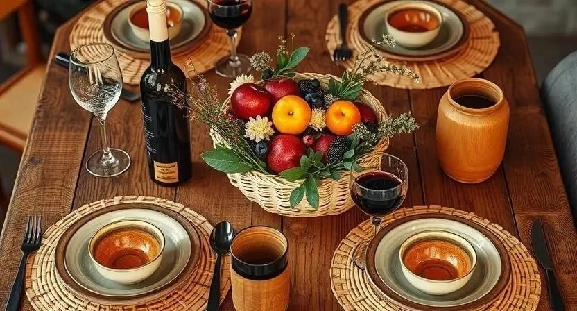 1. Используйте деревянную скатерть или дорожку. 2. Расставьте глиняную или керамическую посуду. 3. Разложите деревянные приборы. 4. Используйте льняные салфетки. 5. Украсьте стол шишками, листьями или фруктами. 6. Добавьте свечи в деревянных подсвечниках. 7. Создайте атмосферу уюта и тепла.