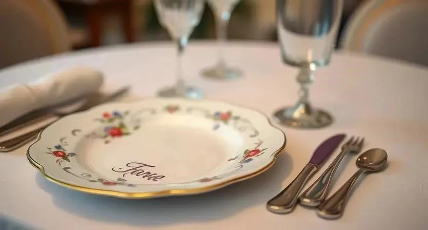 - Сервировка для особого случая: Дорогая фарфоровая посуда с золотой отделкой, шелковая скатерть с вышивкой, хрустальные бокалы, серебряные столовые приборы, большая цветочная композиция в центре стола.