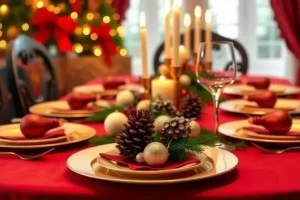 Для новогодней сервировки можно использовать хвойные ветки, шишки, елочные игрушки и зелень. Создайте композиции из еловых веток, украсьте стол свечами и гирляндами. Цветовая гамма – красный, зеленый, золотой.