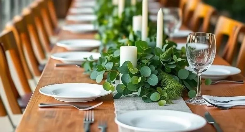 Создайте зеленые дорожки на столе, используя ветки, листья или мох. Это простой и эффектный способ добавить свежести и природной красоты. Я однажды использовала длинную ветку эвкалипта, чтобы создать дорожку по центру стола – получилось очень стильно и элегантно.