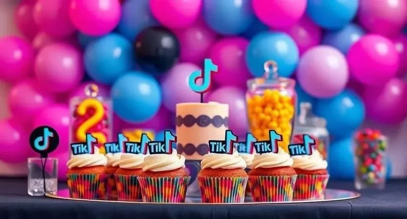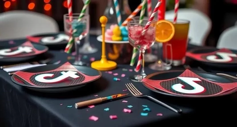 Сервировка стола должна соответствовать стилю Тик-Тока. Используйте скатерти в фирменных цветах, посуду с символикой соцсети и топперы для блюд. Я помню, как на одном из дней рождений мы сделали топперы с логотипом Тик-Тока – получилось очень стильно и оригинально.