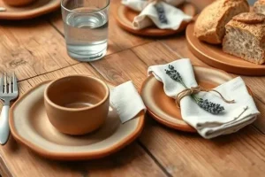 Выбор посуды для сервировки в стиле Прованс – важный этап. Идеально подойдут керамические тарелки с неровными краями, будто бы сделанные вручную. Фарфоровая посуда с цветочным рисунком или узором в стиле «шеврон» также будет уместна. Приветствуются винтажные сервизы с потертостями и сколами, которые придают столу особый шарм. Столовые приборы лучше выбирать из серебра или с серебряным покрытием. Бокалы и стаканы могут быть как простыми, так и украшенными гравировкой. Важно, чтобы посуда была не только красивой, но и функциональной.