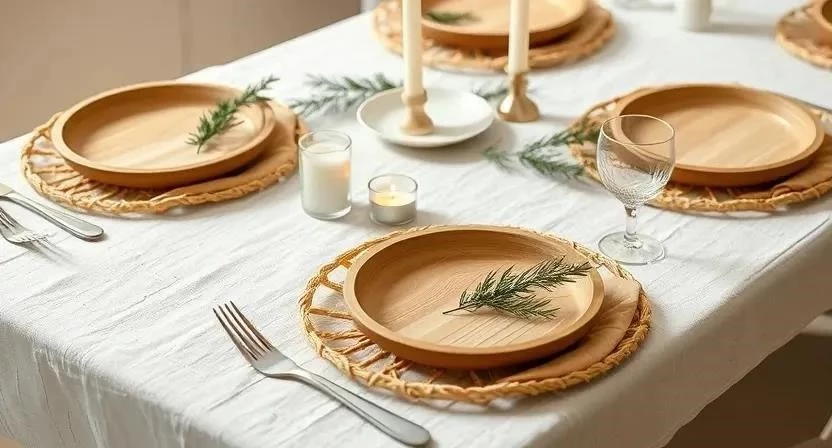 Используйте натуральную посуду, деревянные подставки, свечи и еловые ветки для украшения стола. Поставьте в центр стола красивую композицию из шишек, веток и свечей. Используйте льняные салфетки и скатерть светлого оттенка. Главное – создать атмосферу праздника и уюта.
