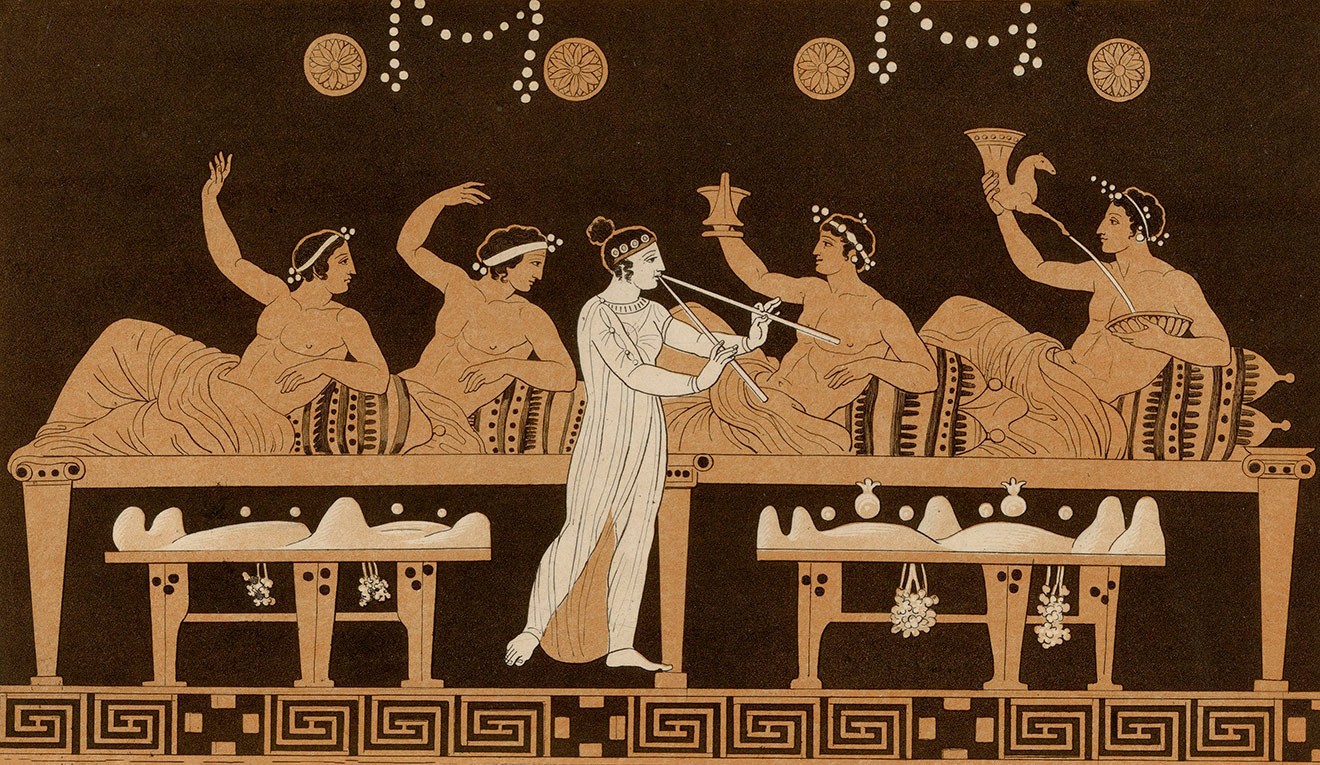 Во время симпозиума мужчины пускали по кругу общую чашу с вином, наслаждались игрой девушек-флейтисток или другими музыкальными номерами. Целью симпозиума было получить удовольствие от диалогов философов, искусства музыкантов и общения с друзьями.